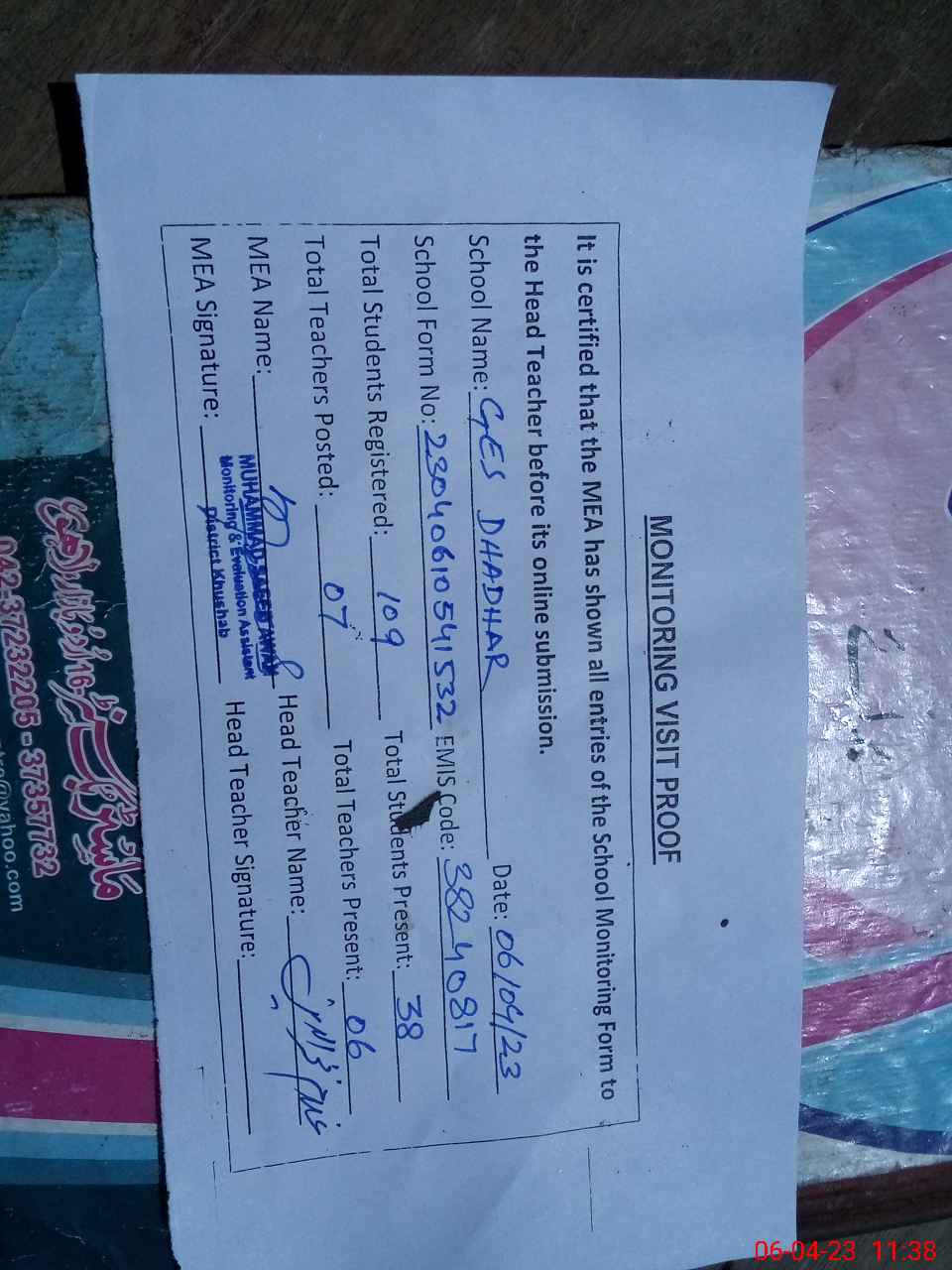 | Attendance Register | Head Teacher | MEA with School | Visit Proof |