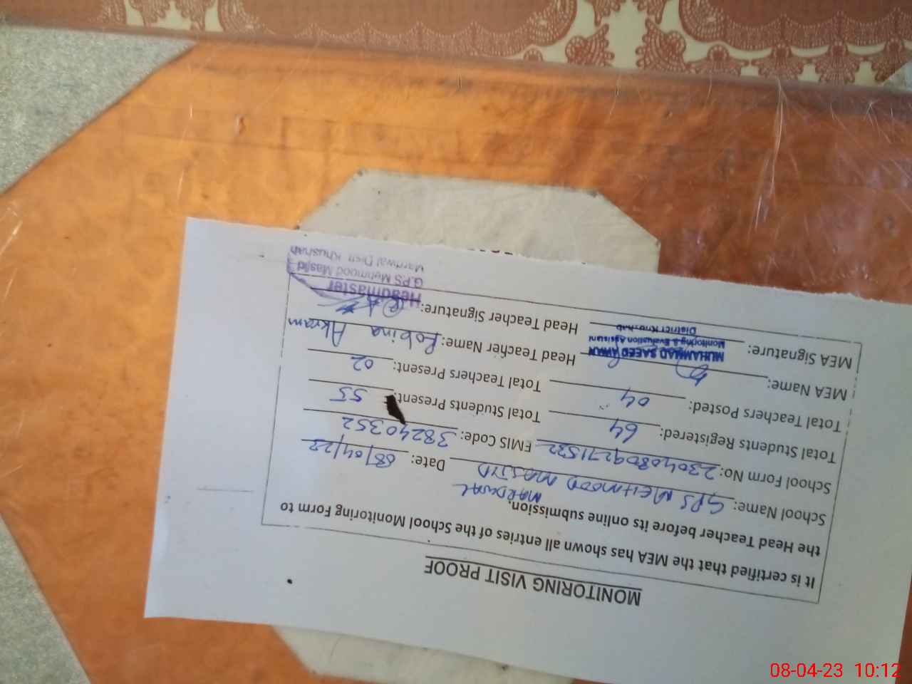 | Attendance Register | Head Teacher | MEA with School | Visit Proof |
