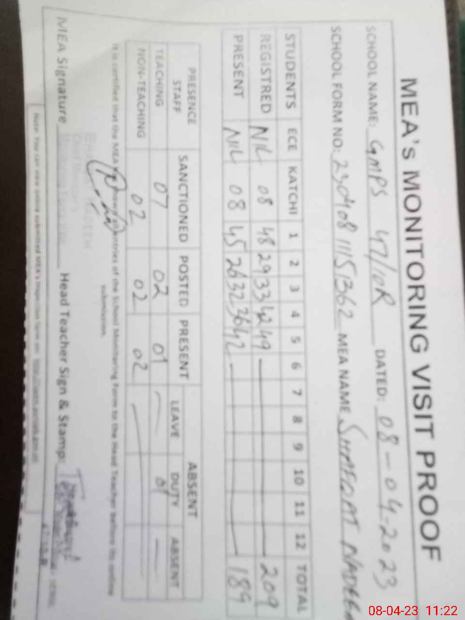 | Attendance Register | Head Teacher | MEA with School | Visit Proof |
