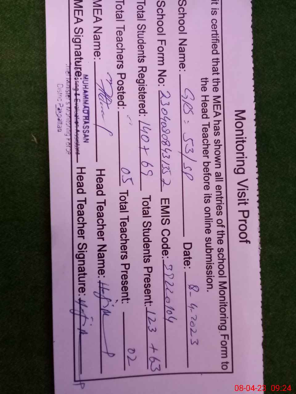 | Attendance Register | Head Teacher | MEA with School | Visit Proof |