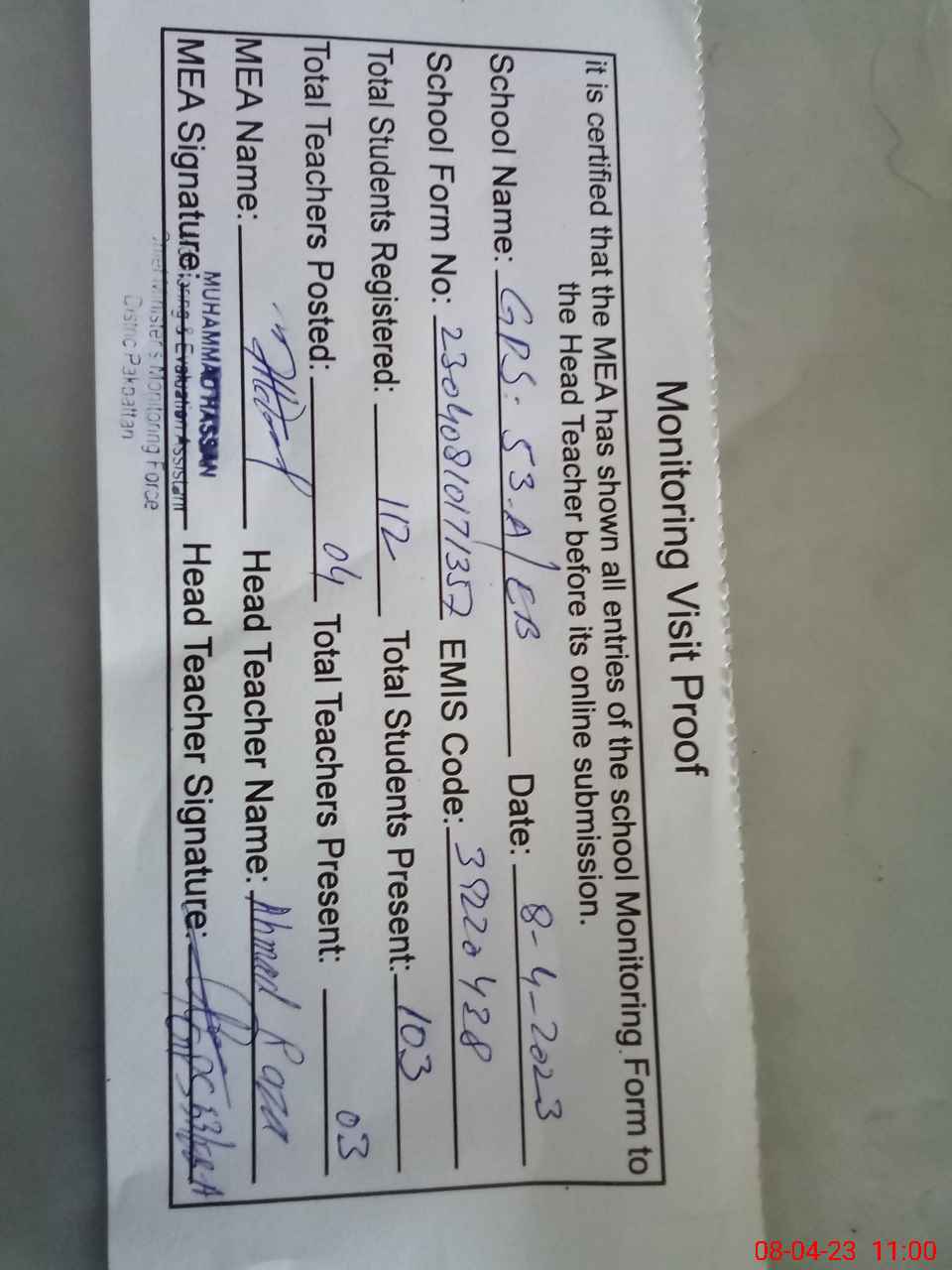 | EMIS Code: 39220438 | Name of School: GPS CHAK NO. 53 EB A | |||