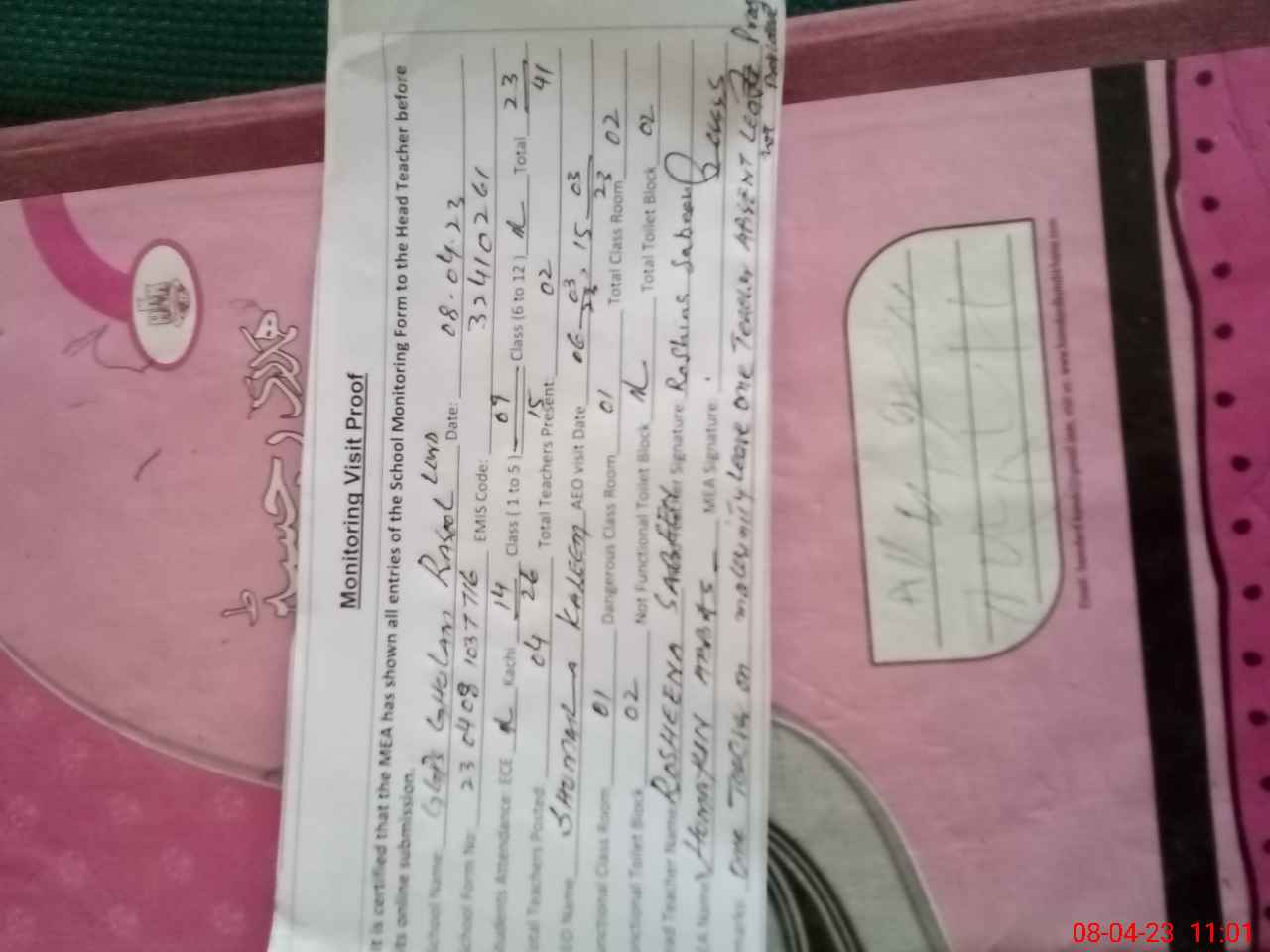 | Remarks (Use Separate Page if Required): One teacher on maternity leave uzma Rani pst absent leave proof not provided one class room dangerous overall cleaness good D3 form not available | |||||