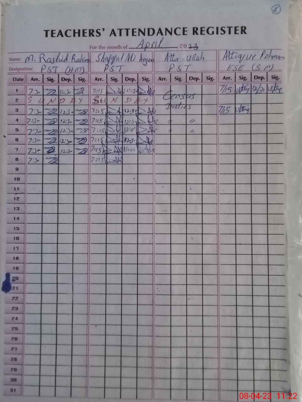 | CNIC | Full Name | Designation | R/C | Absence During Last Calender Month |