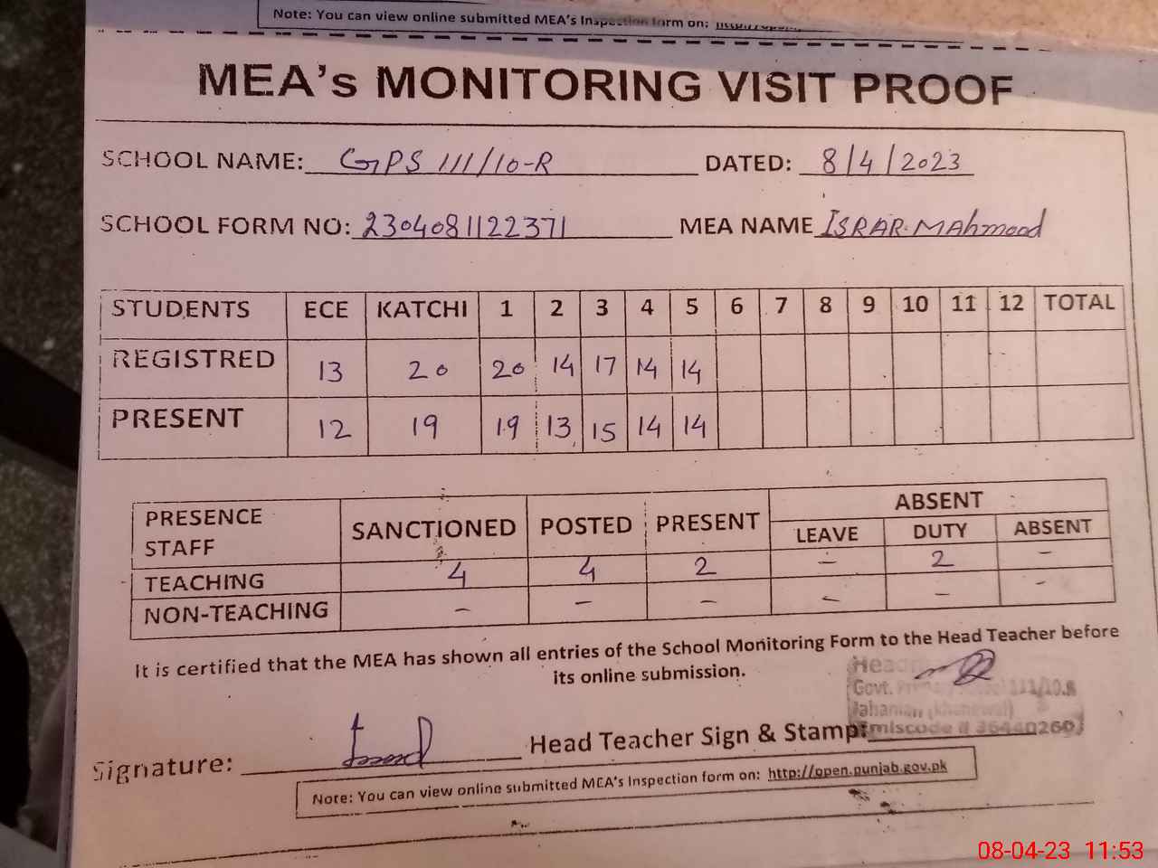 | Attendance Register | Head Teacher | MEA with School | Visit Proof |