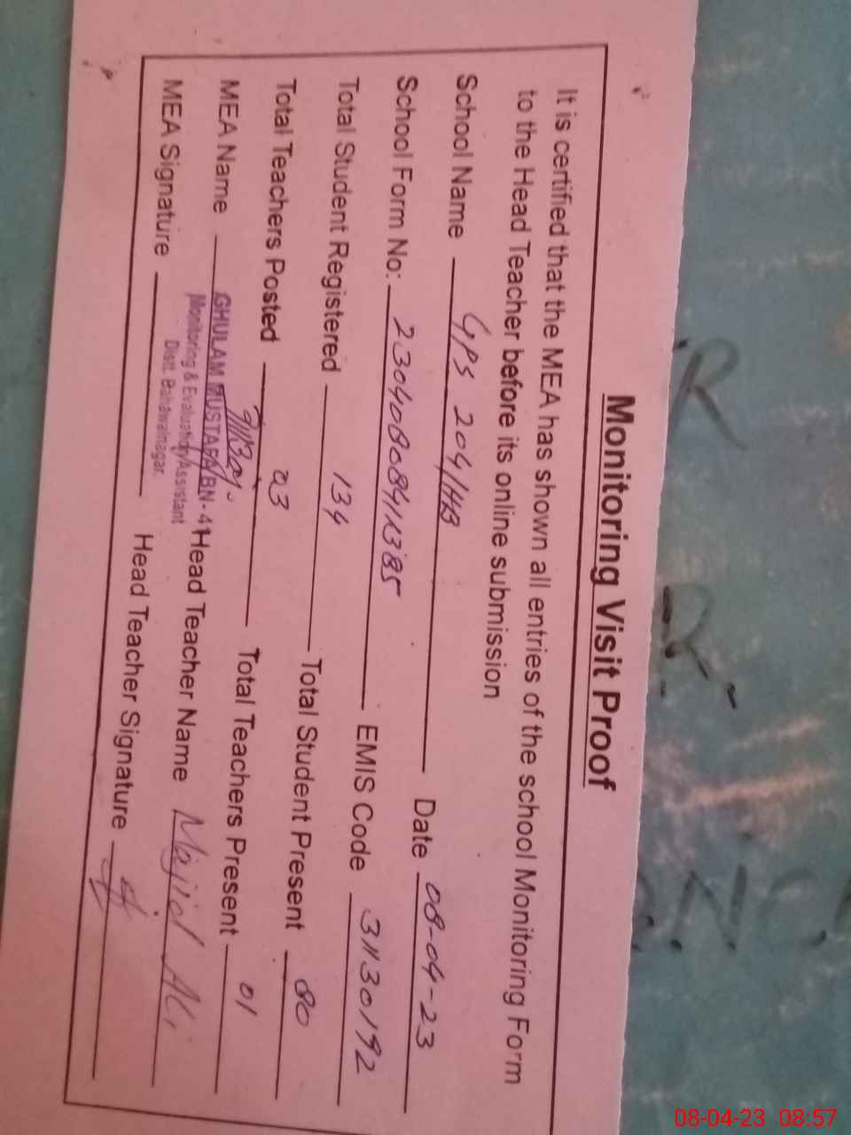 | Attendance Register | Head Teacher | MEA with School | Visit Proof |
