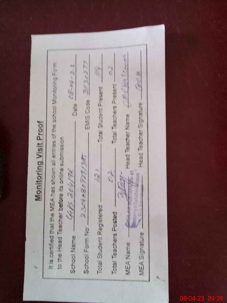 | Attendance Register | Head Teacher | MEA with School | Visit Proof |