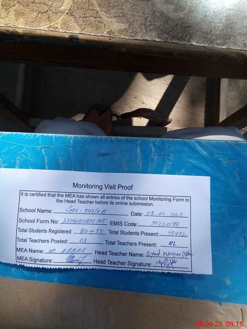 | Attendance Register | Head Teacher | MEA with School | Visit Proof |