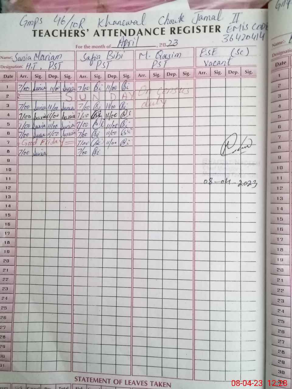 | Name: Sa**** Bi**** Designation: (School Headmaster's/Headmistress's) PST Phone/Cell Number: 03**** |