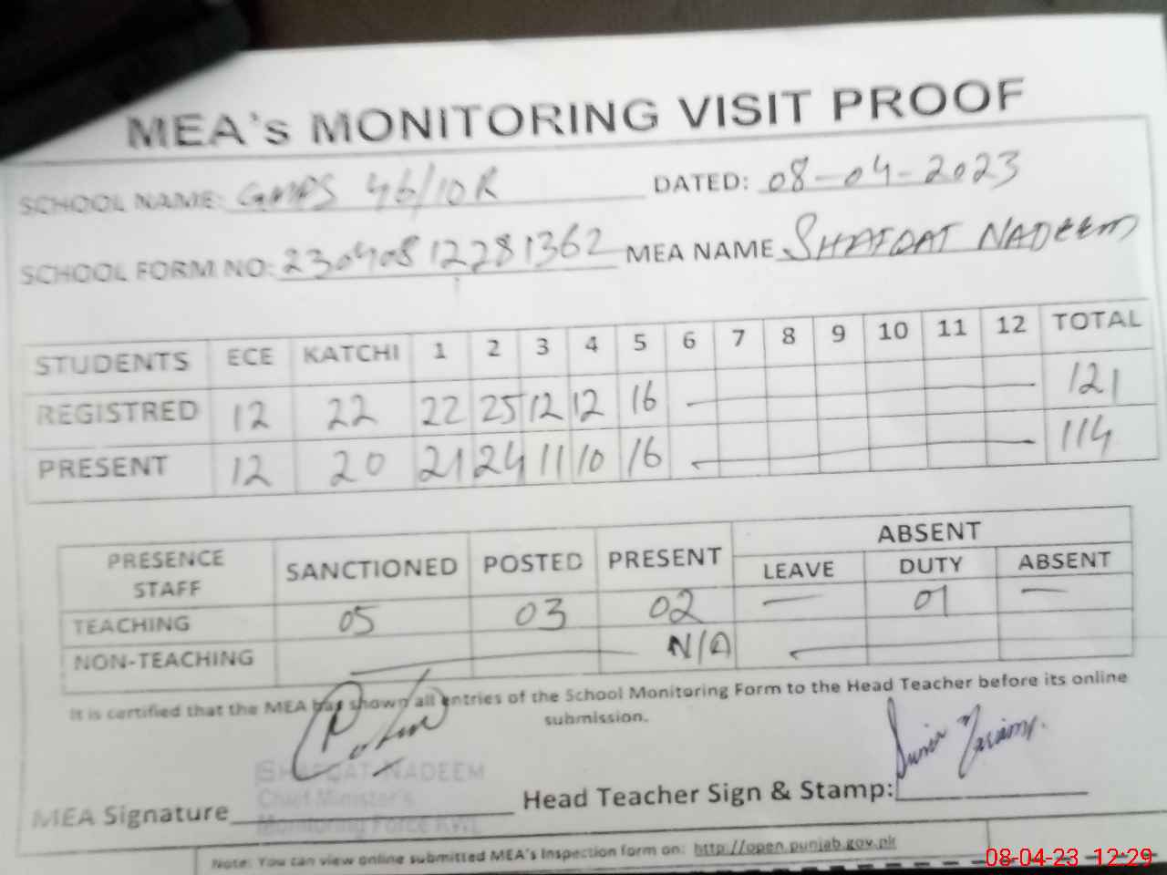 | Attendance Register | Head Teacher | MEA with School | Visit Proof |