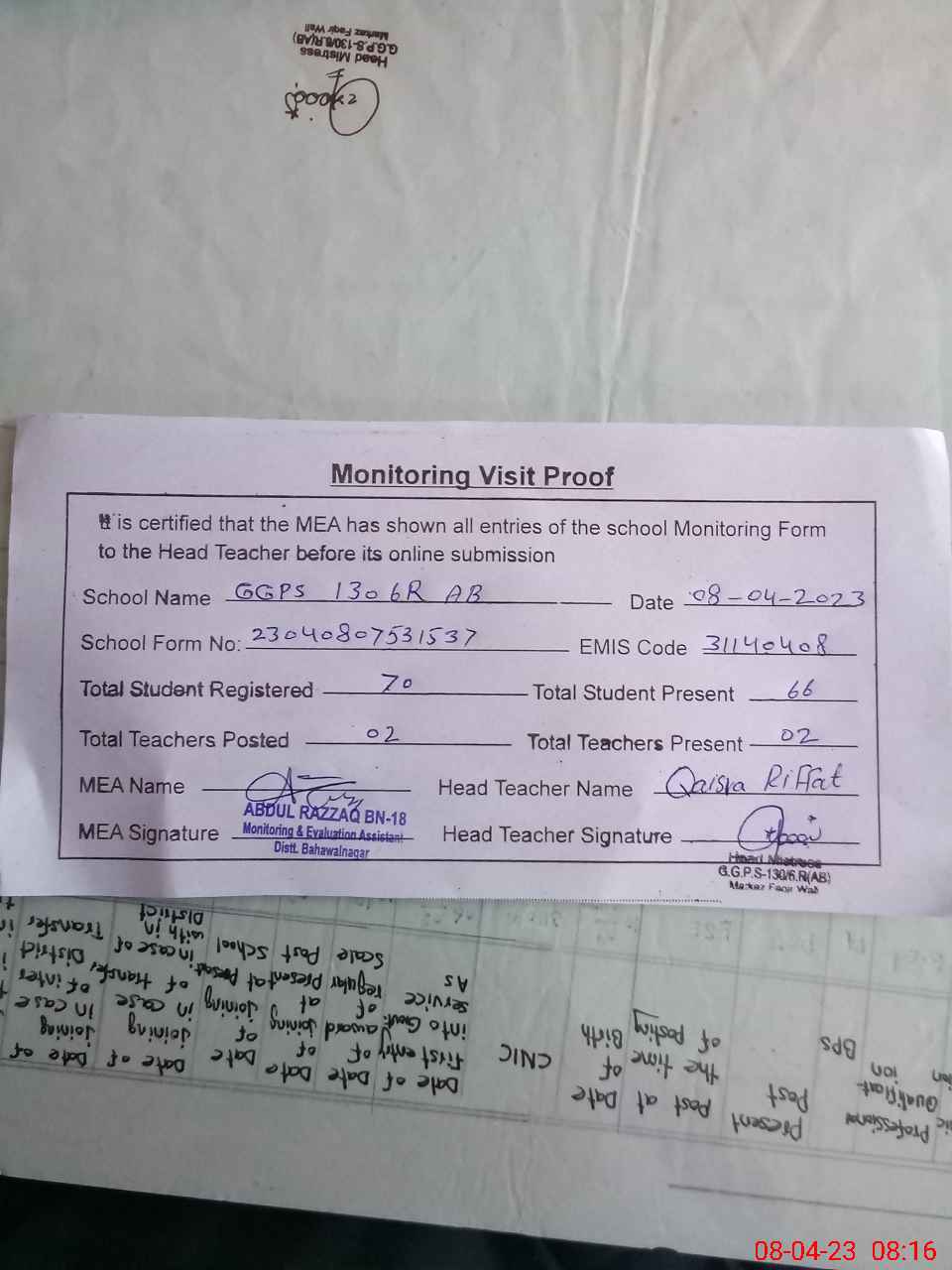 | Attendance Register | Head Teacher | MEA with School | Visit Proof |