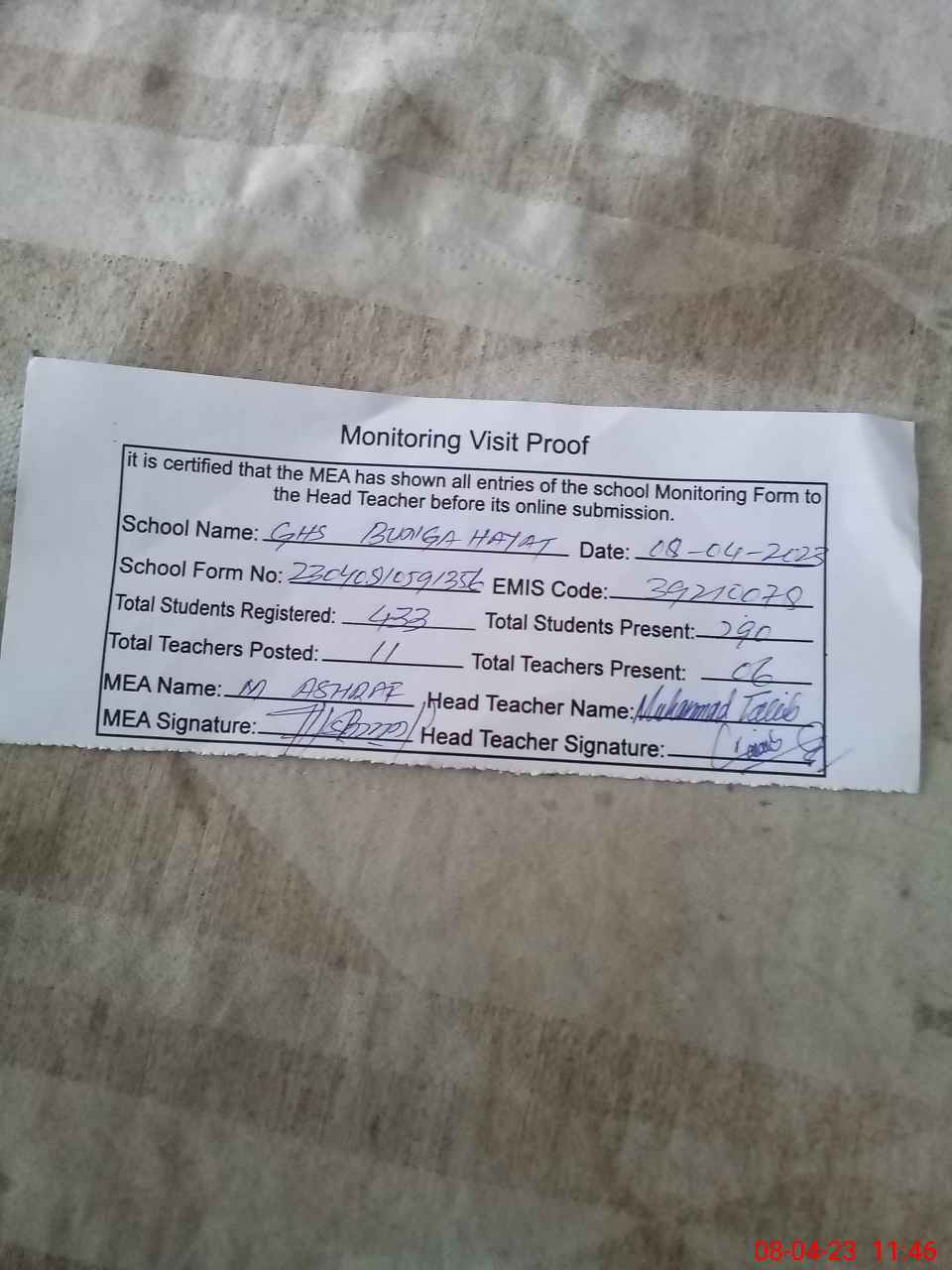 | Attendance Register | Head Teacher | MEA with School | Visit Proof |