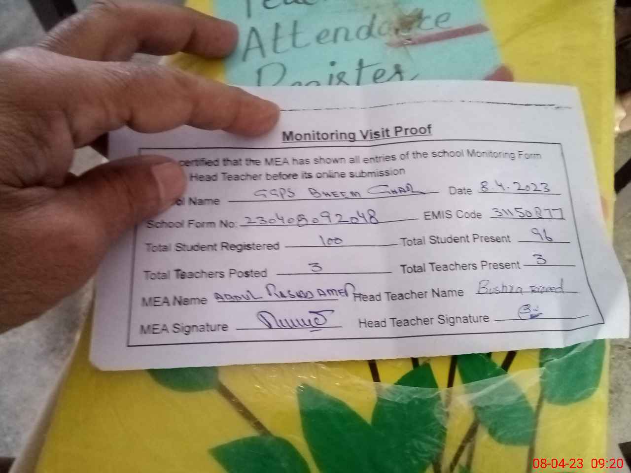| Attendance Register | Head Teacher | MEA with School | Visit Proof |
