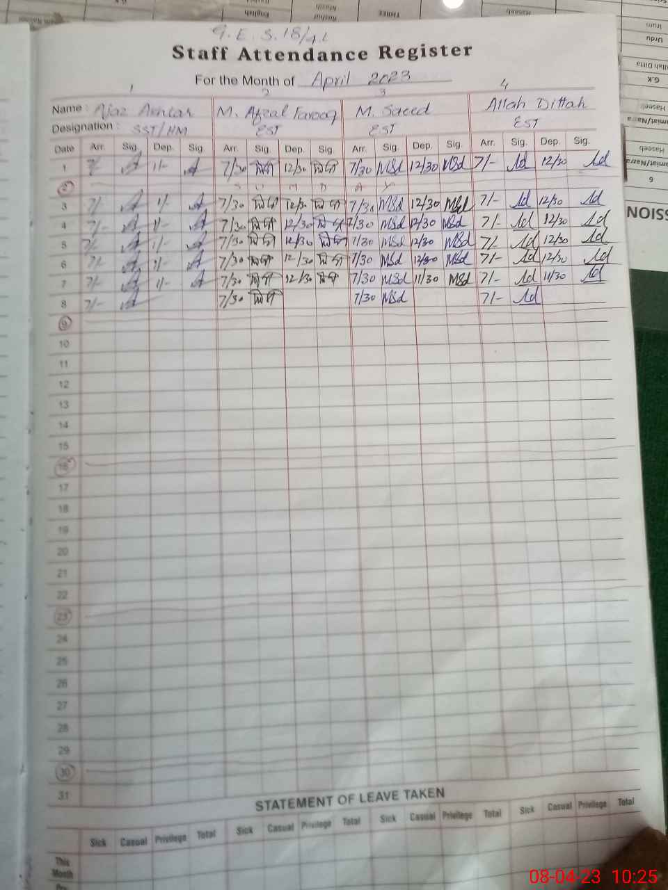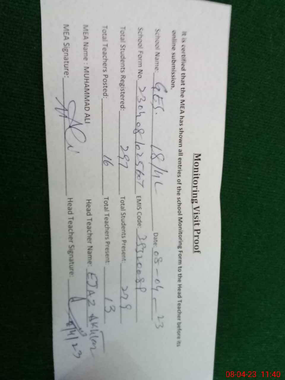 | Attendance Register | Head Teacher | MEA with School | Visit Proof |