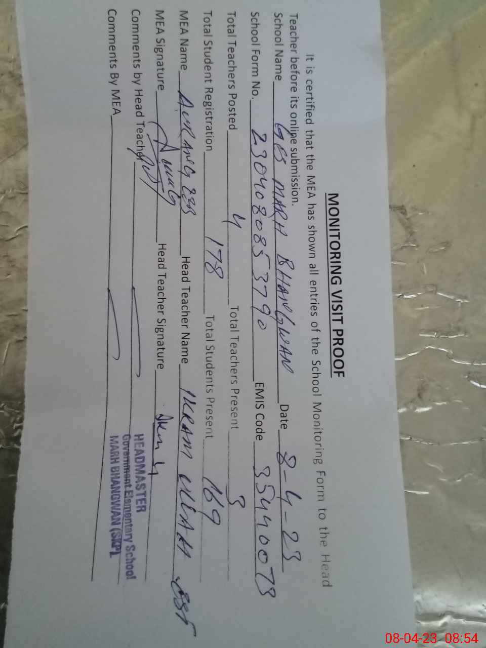 | Attendance Register | Head Teacher | MEA with School | Visit Proof |