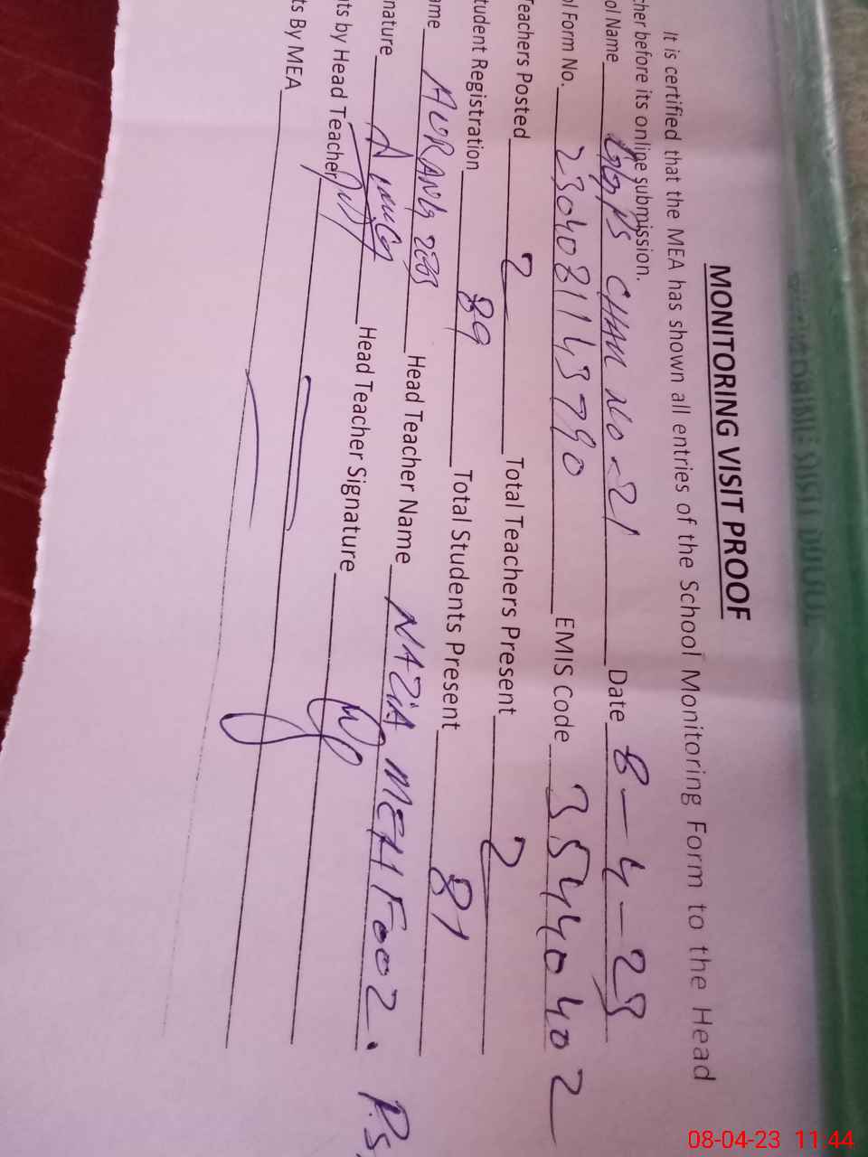 | Attendance Register | Head Teacher | MEA with School | Visit Proof |