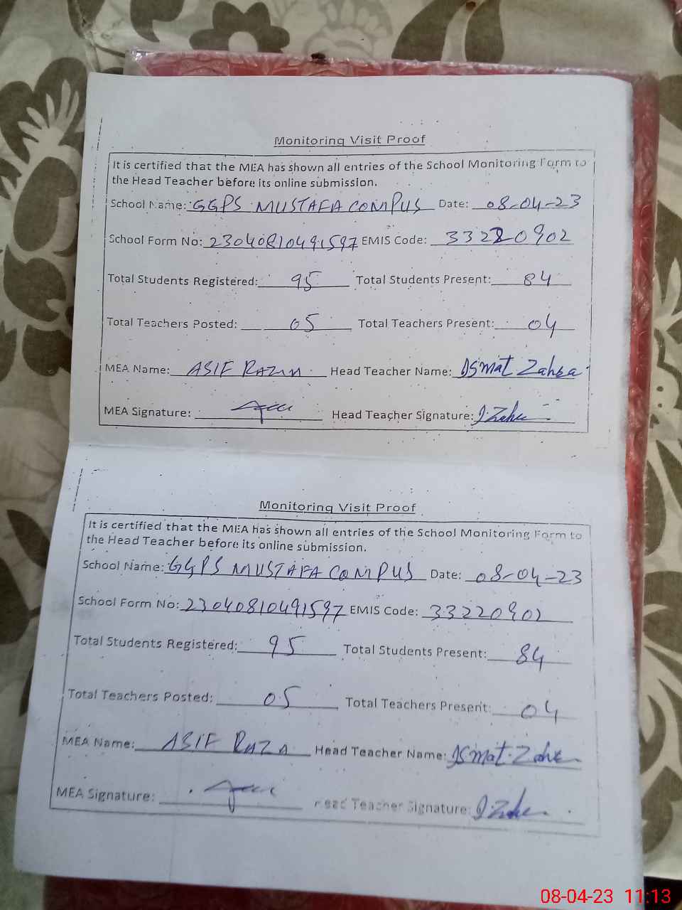| Attendance Register | Head Teacher | MEA with School | Visit Proof |
