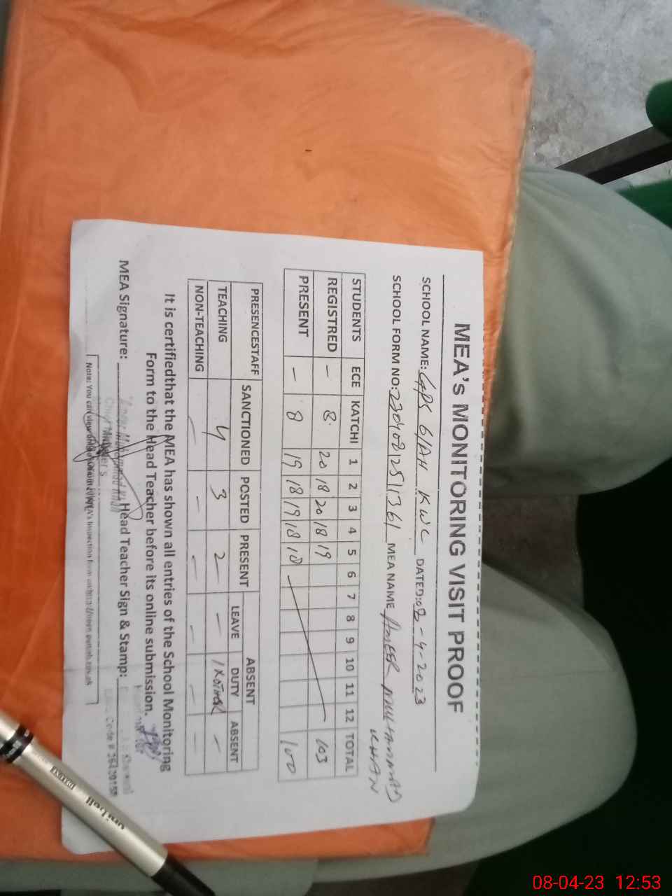 | Attendance Register | Head Teacher | MEA with School | Visit Proof |