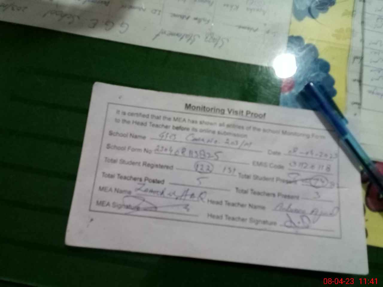 | Attendance Register | Head Teacher | MEA with School | Visit Proof |