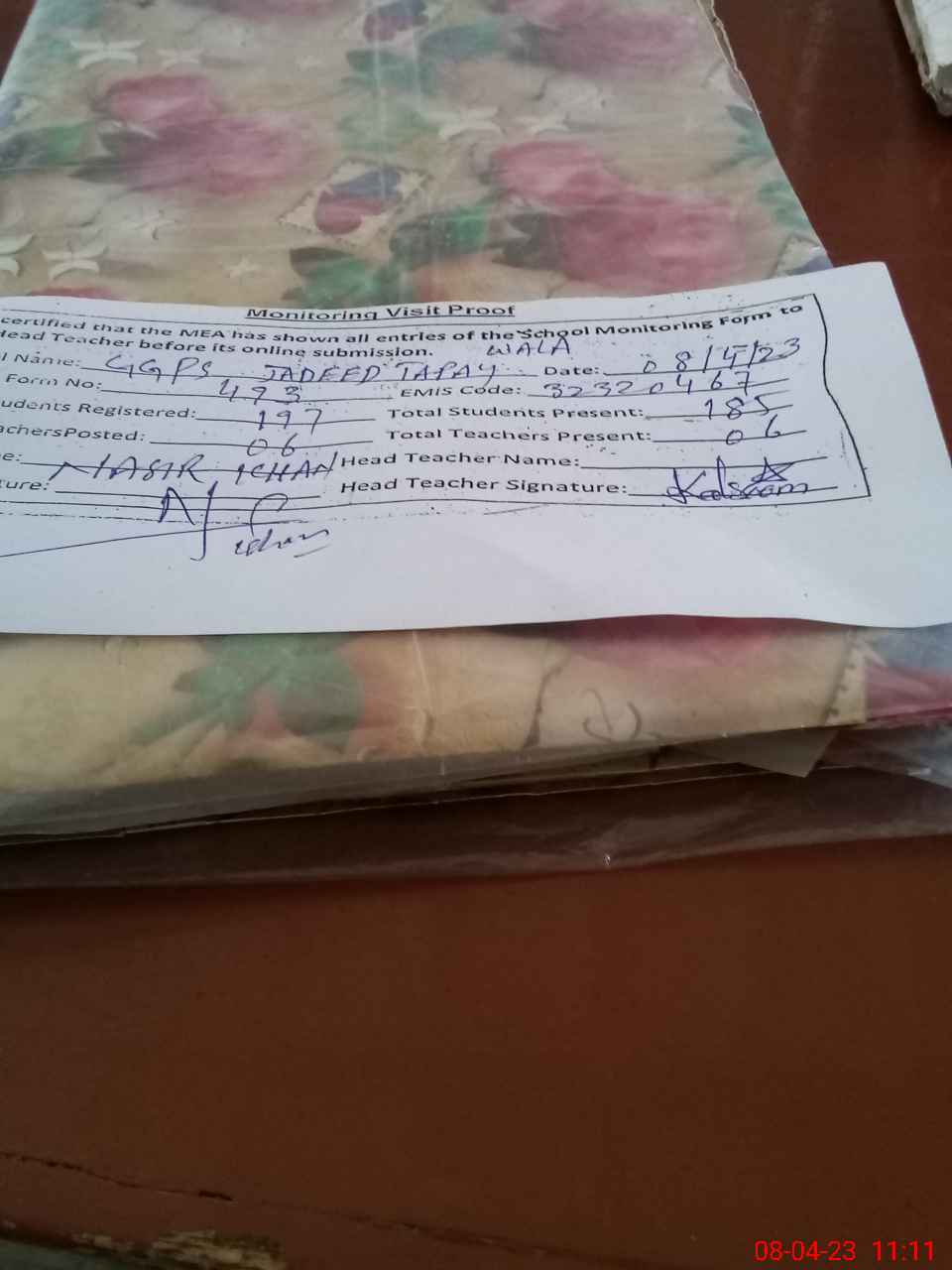 | Attendance Register | Head Teacher | MEA with School | Visit Proof |