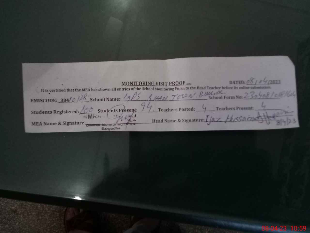 | Monitoring Date: 08-04-2023 | Start Time: 08-04-2023 10:18 AM | End Time: 08-04-2023 11:01 AM | Name of MEA: IM**** SH**** | |