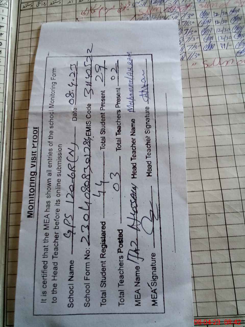 | Attendance Register | Head Teacher | MEA with School | Visit Proof |