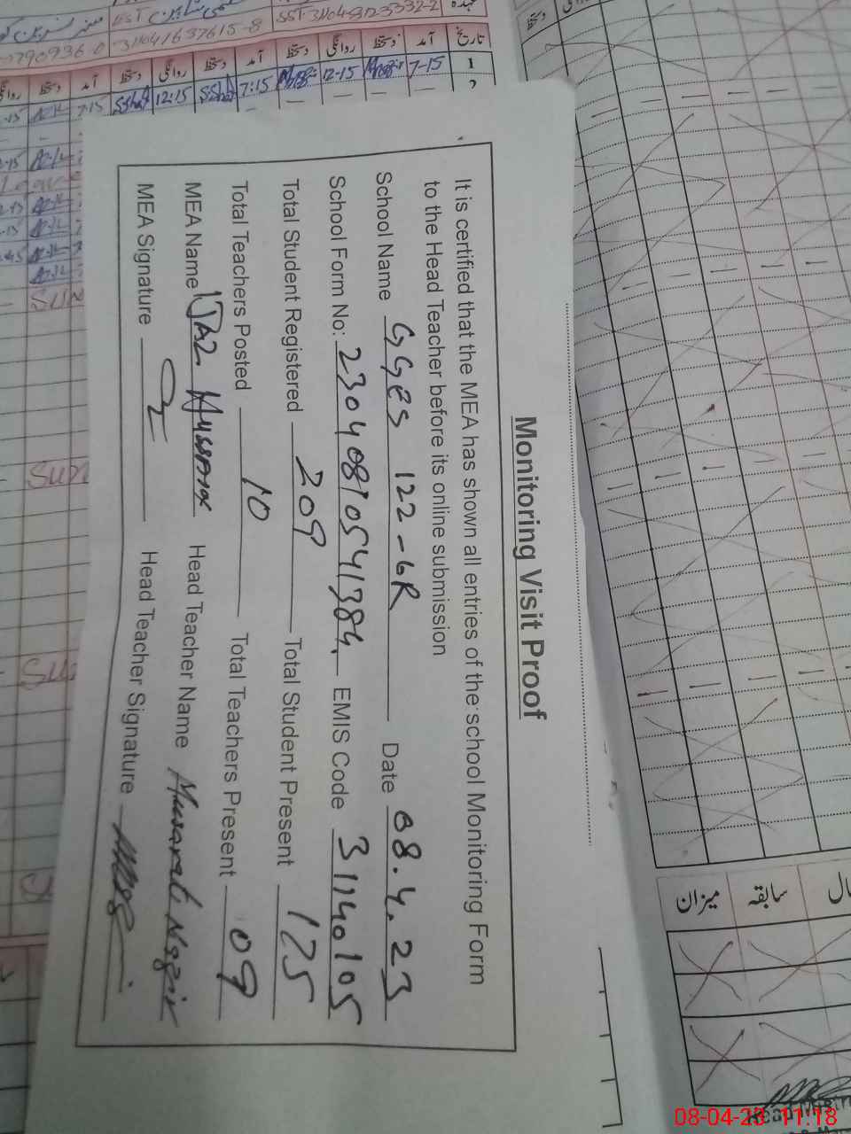 | Attendance Register | Head Teacher | MEA with School | Visit Proof |