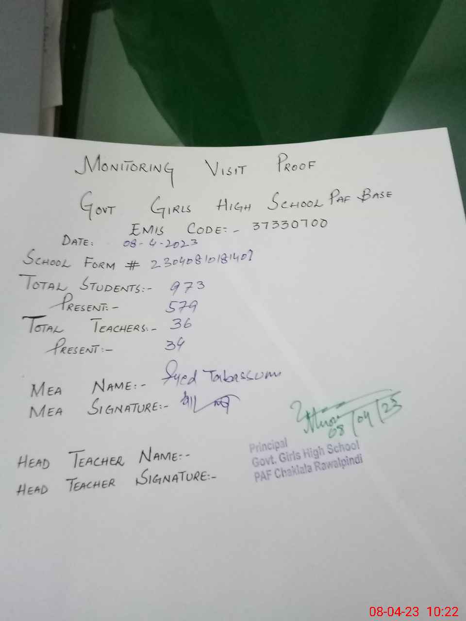 | Attendance Register | Head Teacher | MEA with School | Visit Proof |