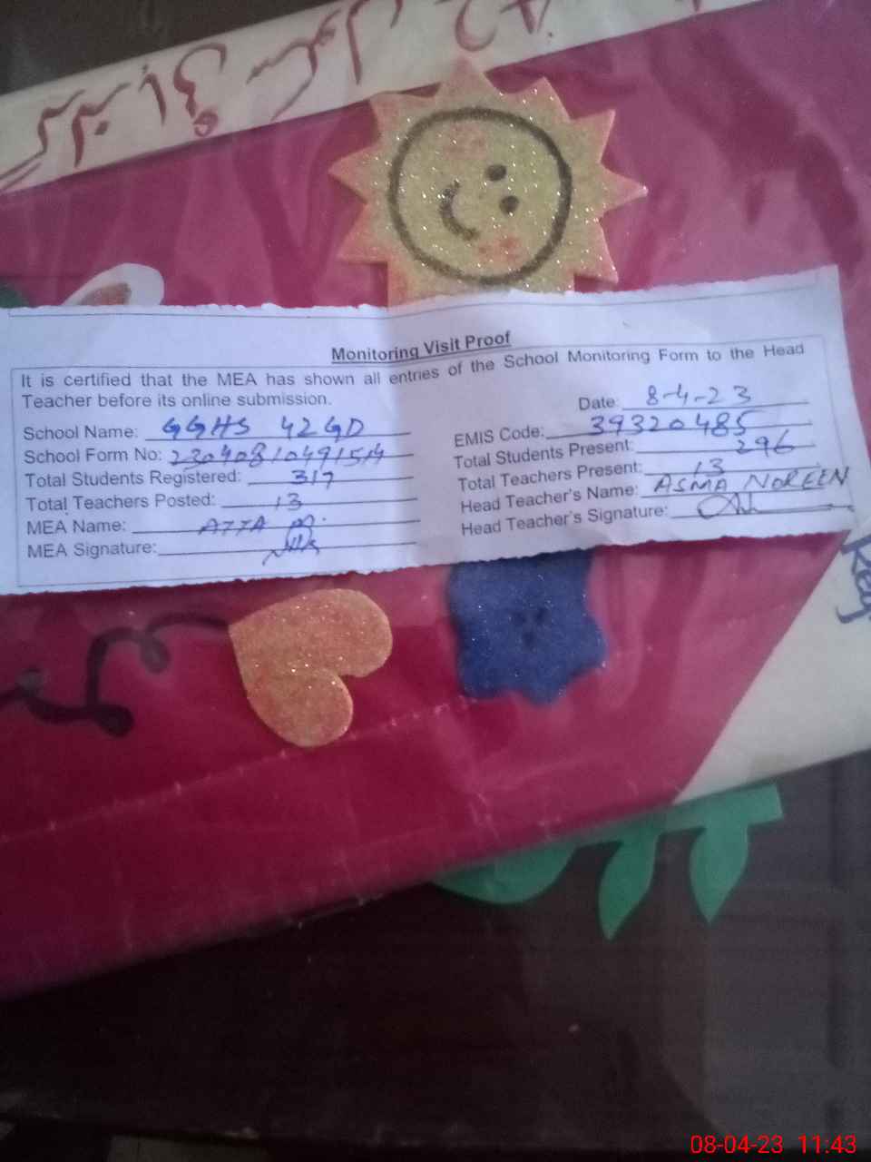 | Attendance Register | Head Teacher | MEA with School | Visit Proof |