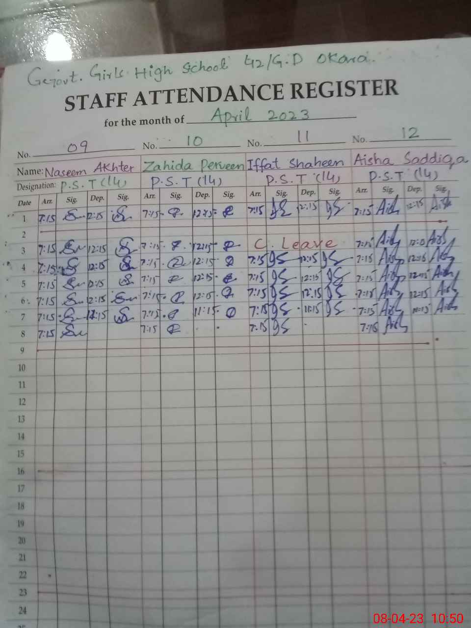 | CNIC | Full Name | Designation | R/C | Absence During Last Calender Month |