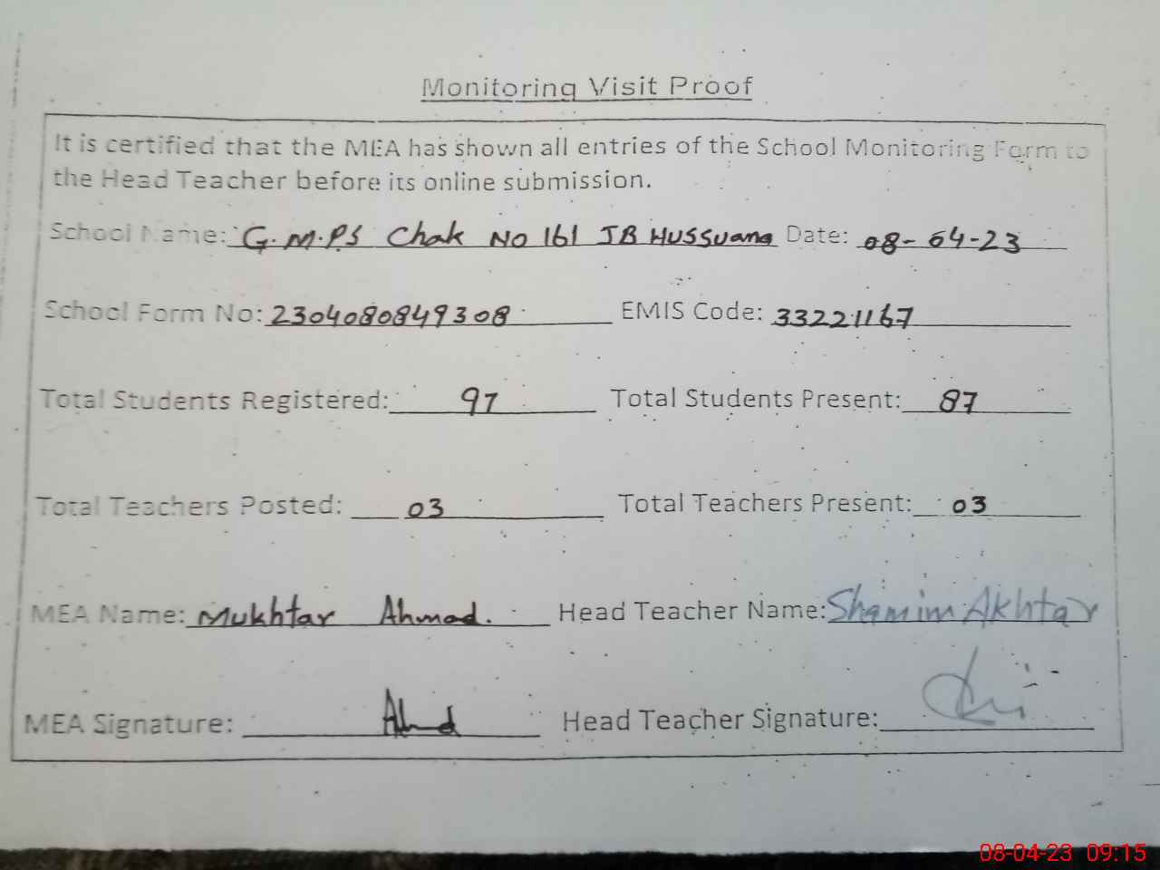 | Attendance Register | Head Teacher | MEA with School | Visit Proof |