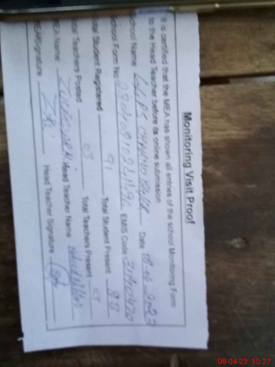 | Attendance Register | Head Teacher | MEA with School | Visit Proof |