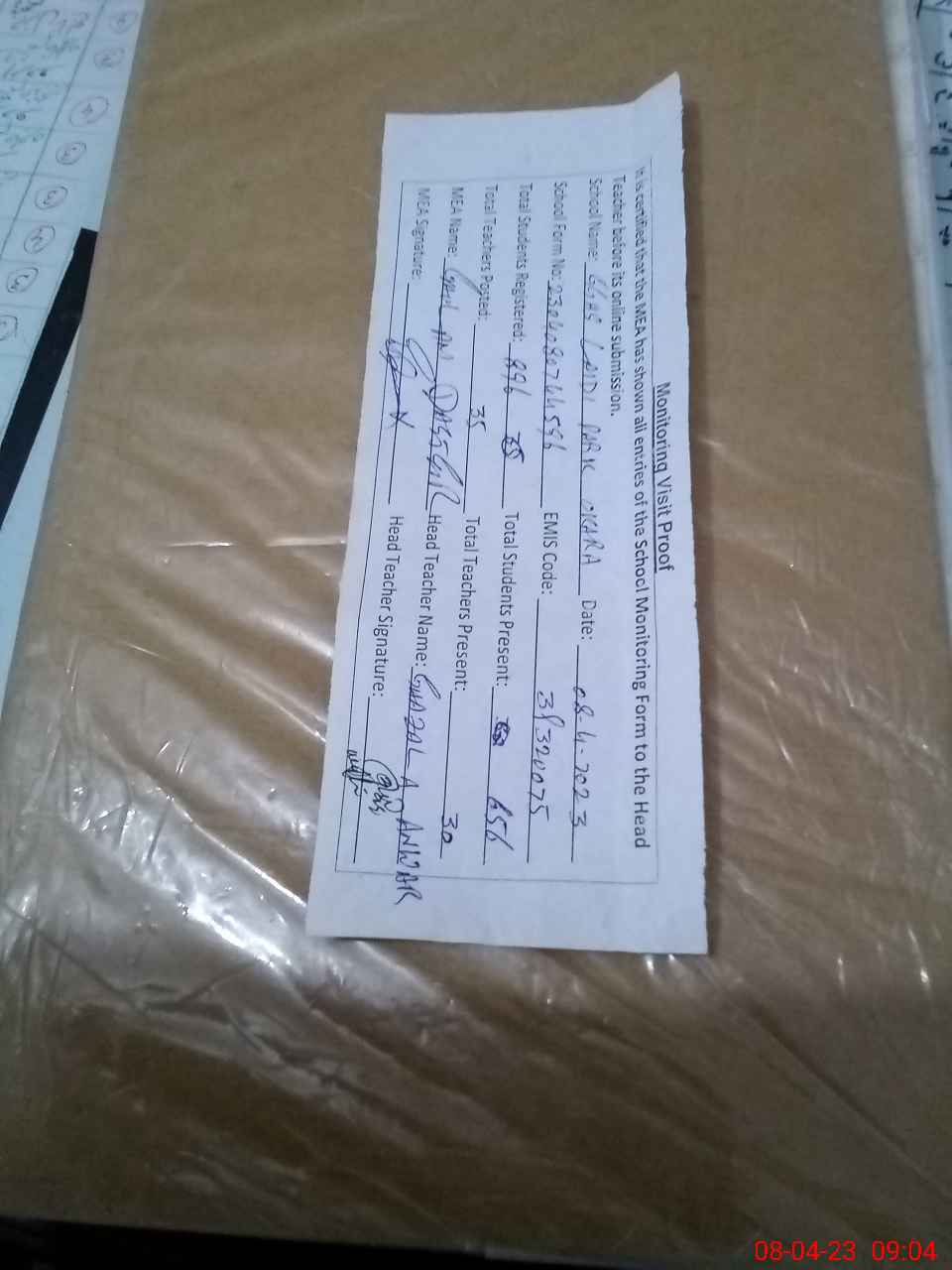 | Attendance Register | Head Teacher | MEA with School | Visit Proof |