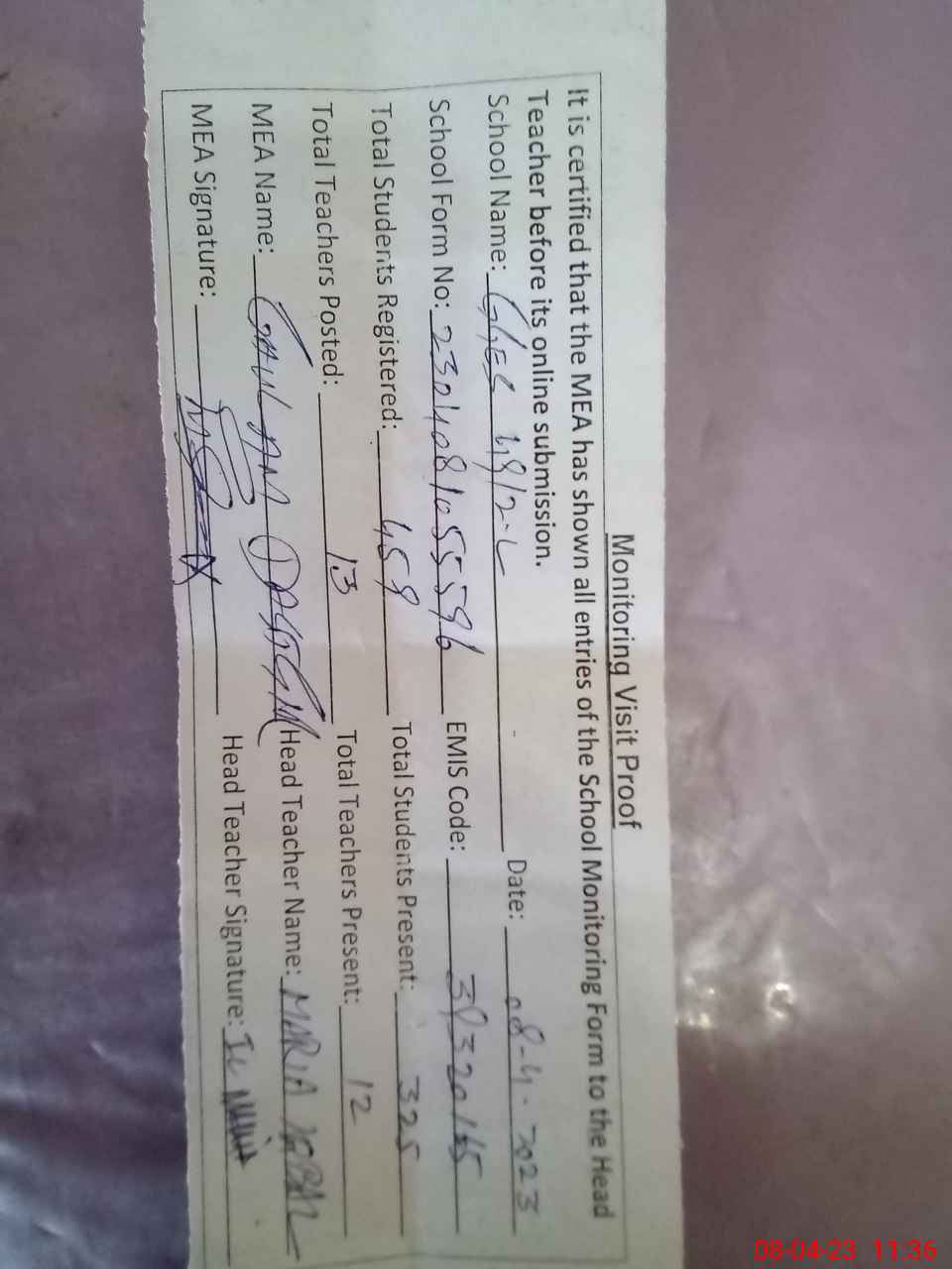 | Attendance Register | Head Teacher | MEA with School | Visit Proof |