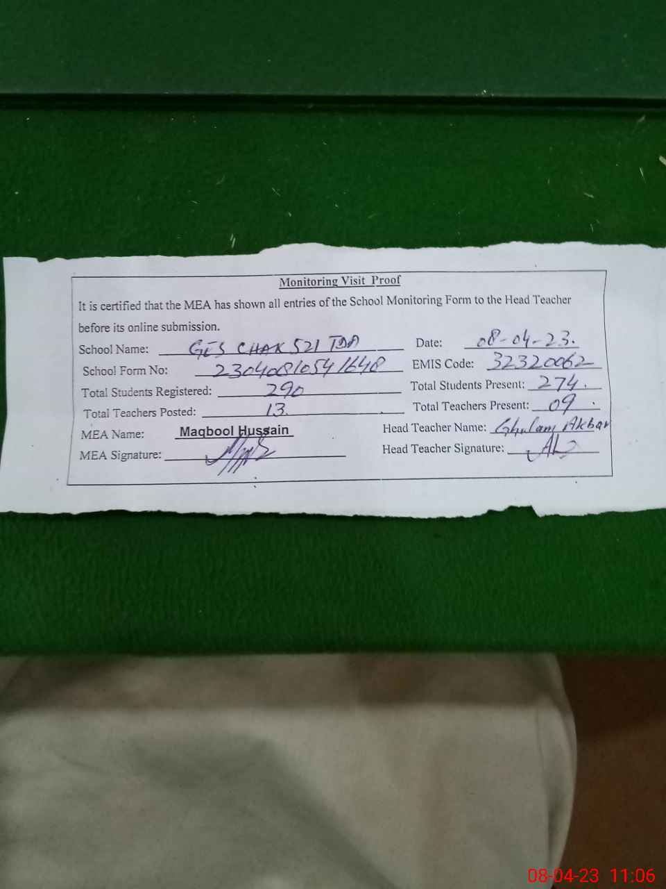 | EMIS Code: 32320062 | Name of School: GES CHAK NO.521 TDA | |||