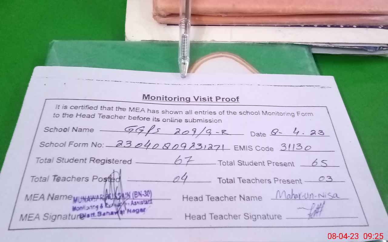 | Attendance Register | Head Teacher | MEA with School | Visit Proof |
