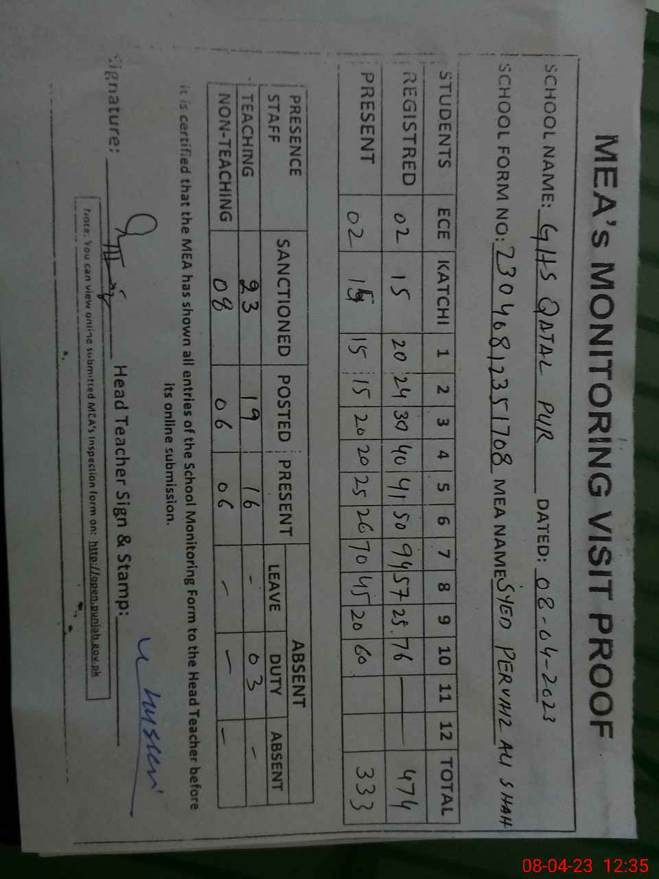 | Attendance Register | Head Teacher | MEA with School | Visit Proof |