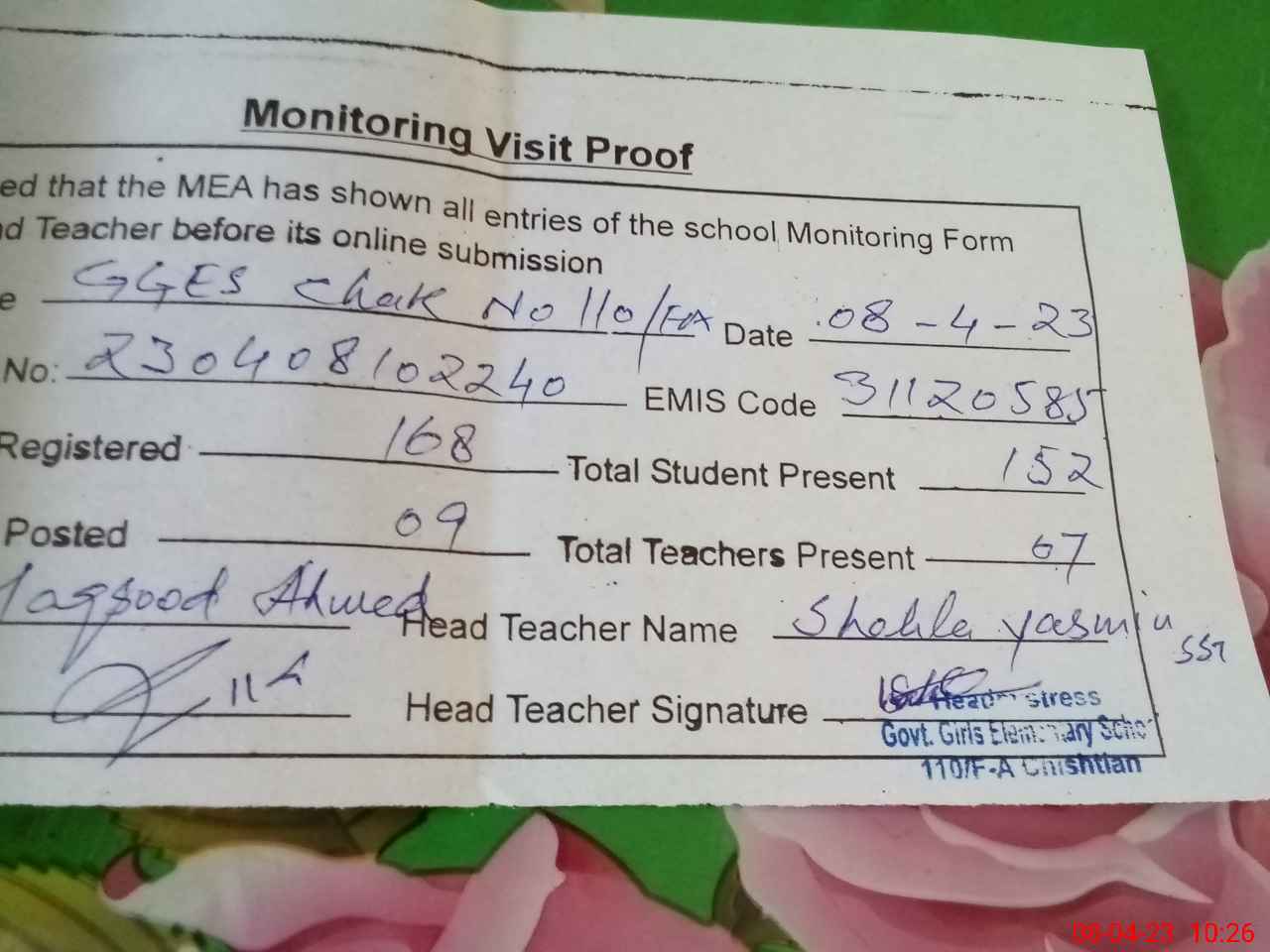 | Attendance Register | Head Teacher | MEA with School | Visit Proof |