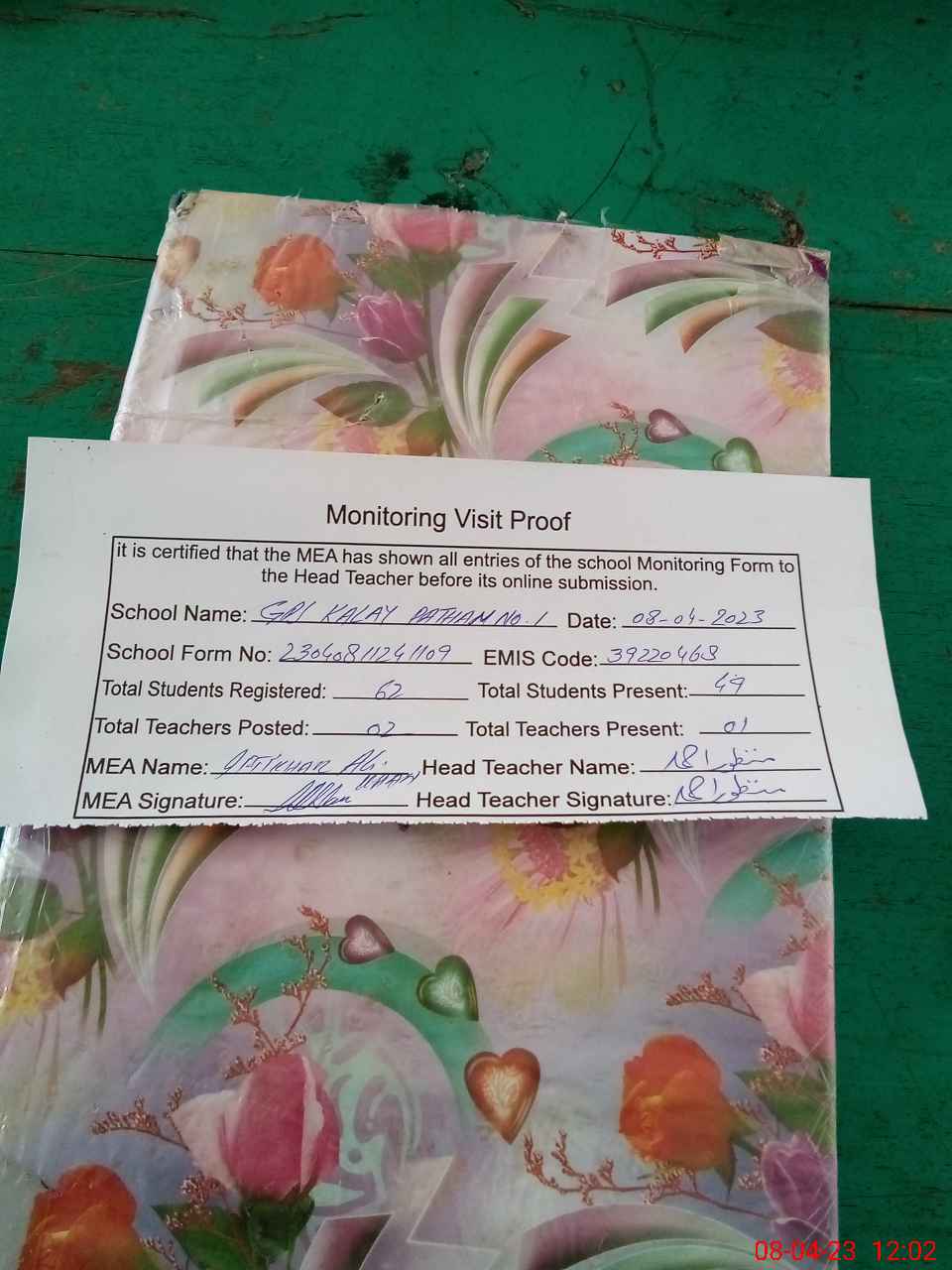 | Attendance Register | Head Teacher | MEA with School | Visit Proof |