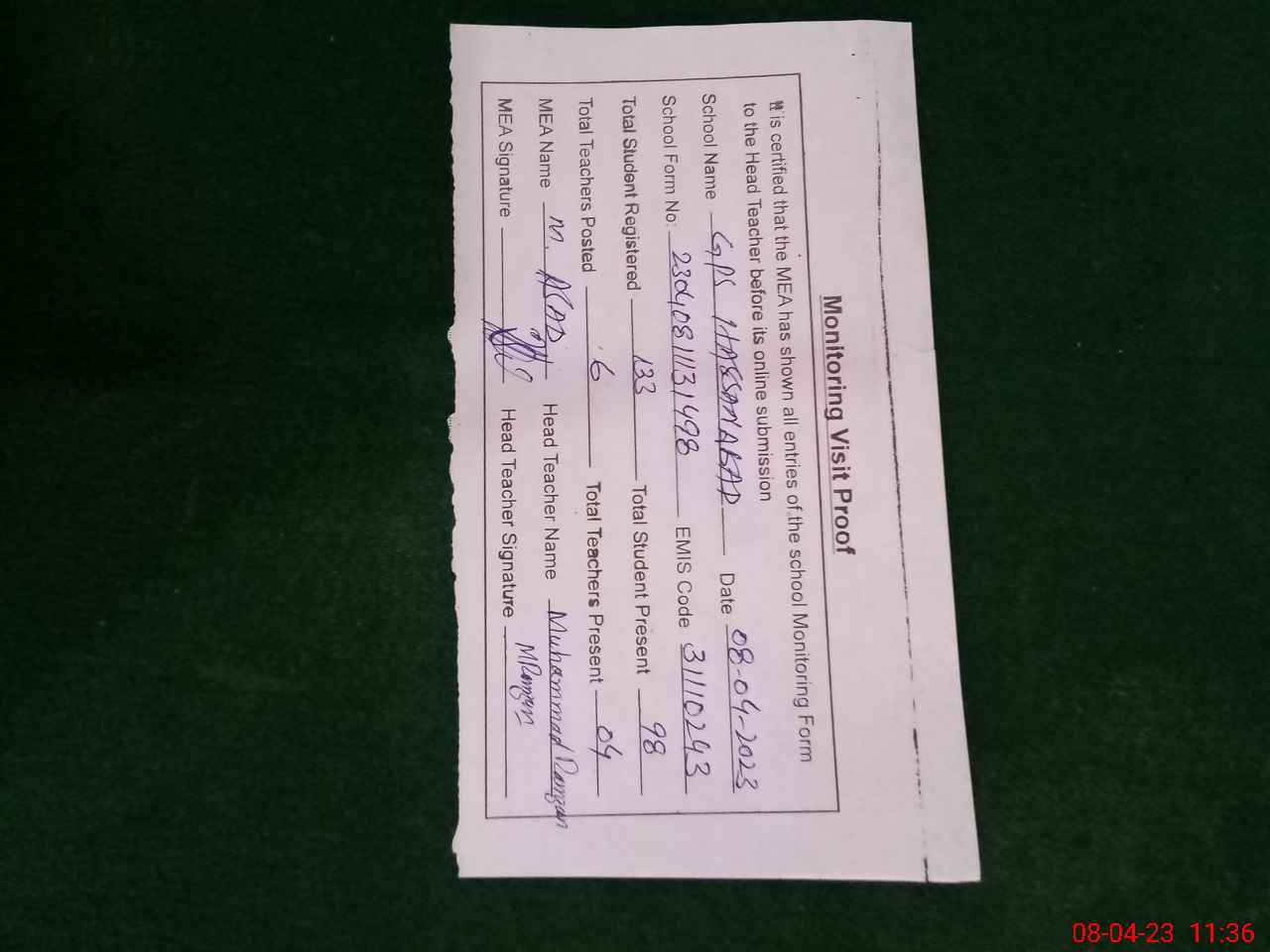| Attendance Register | Head Teacher | MEA with School | Visit Proof |