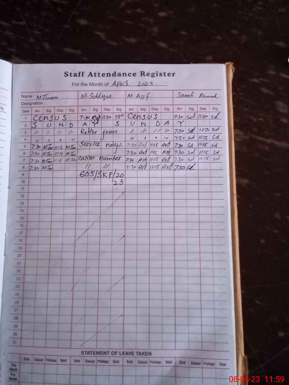 | CNIC | Full Name | Designation | R/C | Absence During Last Calender Month |