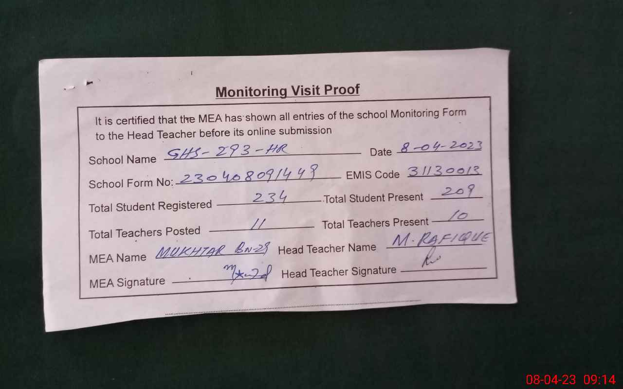 | EMIS Code: 31130013 | Name of School: GHS CHAK 293/HR | |||