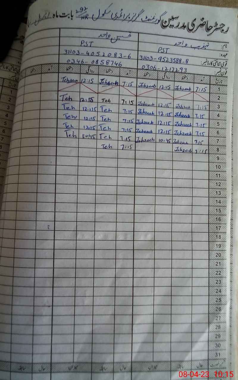 | CNIC | Full Name | Designation | R/C | Absence During Last Calender Month |
