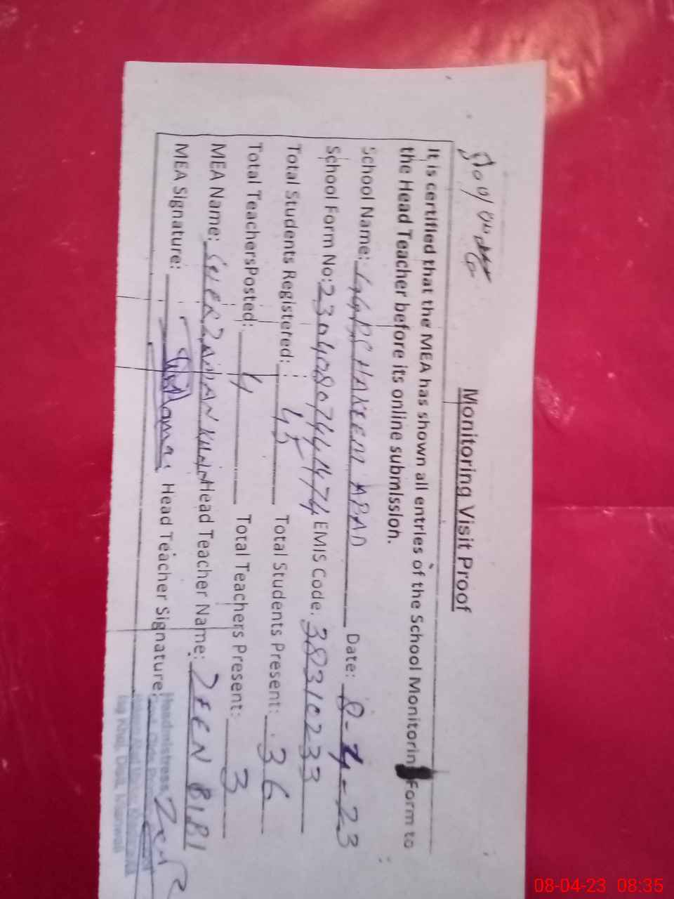 | Attendance Register | Head Teacher | MEA with School | Visit Proof |