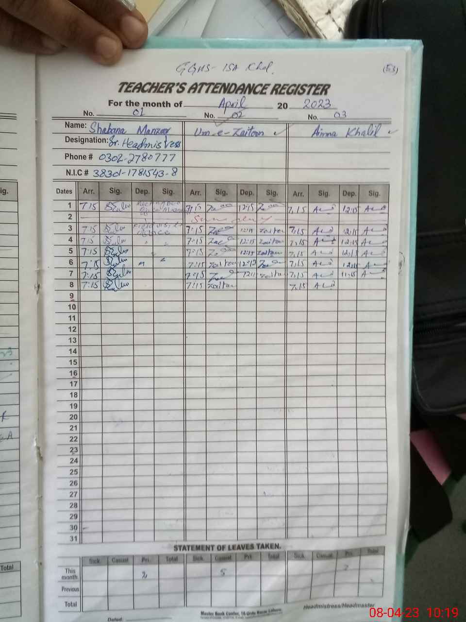 | Name: Ai**** Kh**** Ha**** Designation: (School Headmaster's/Headmistress's) Sst Phone/Cell Number: 03**** |