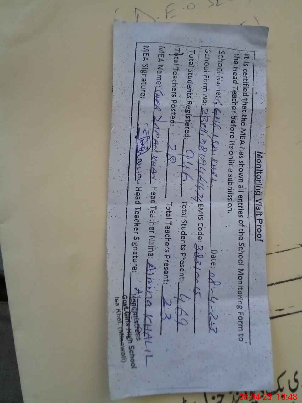 | Attendance Register | Head Teacher | MEA with School | Visit Proof |