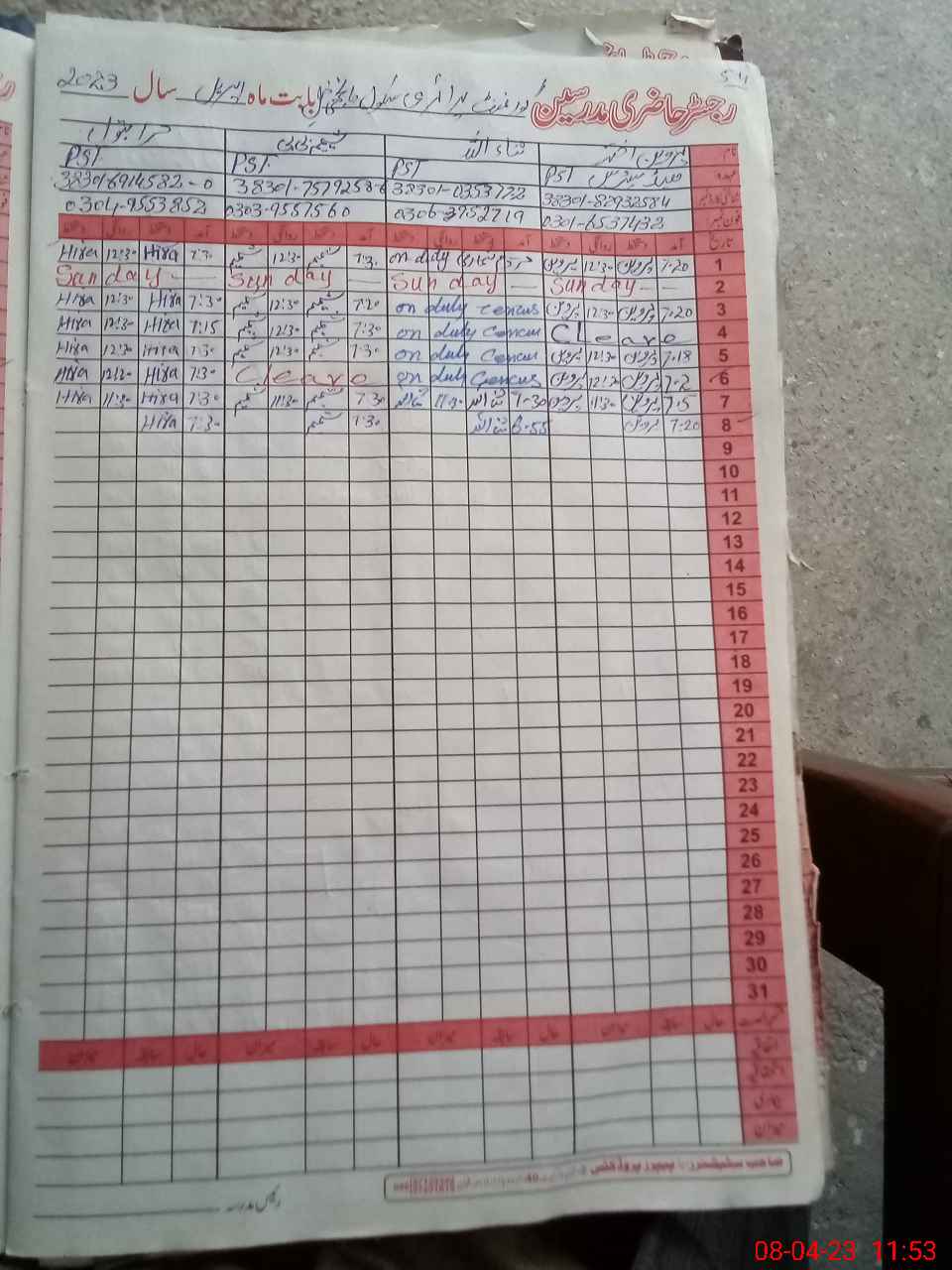 | CNIC | Full Name | Designation | R/C | Absence During Last Calender Month |