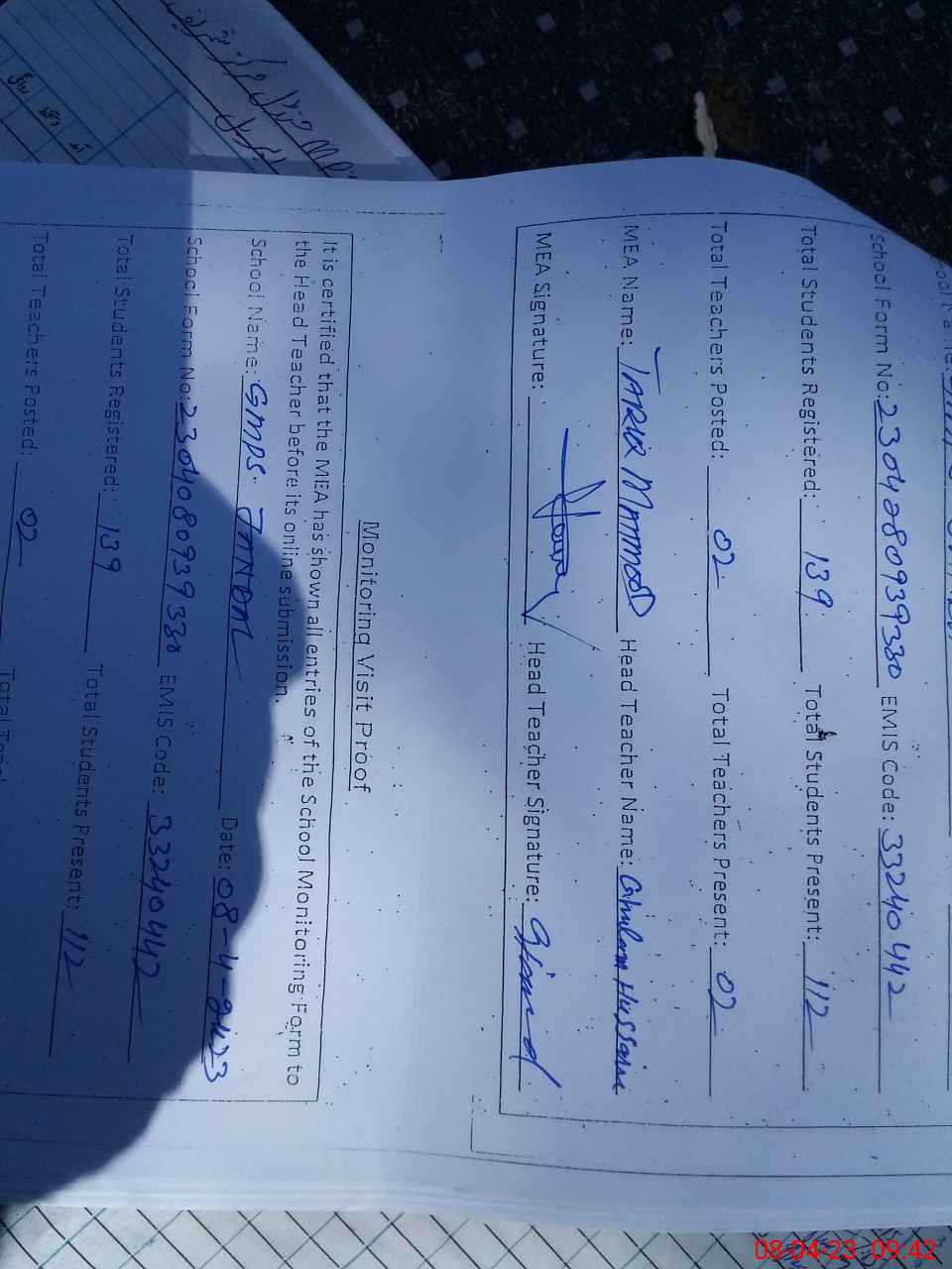| Attendance Register | Head Teacher | MEA with School | Visit Proof |
