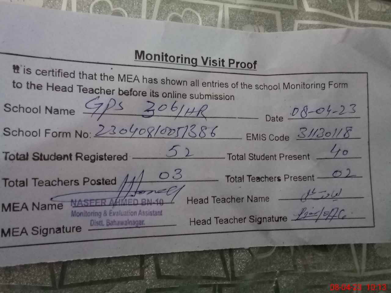 | EMIS Code: 31130118 | Name of School: GPS CHAK 306/HR | |||