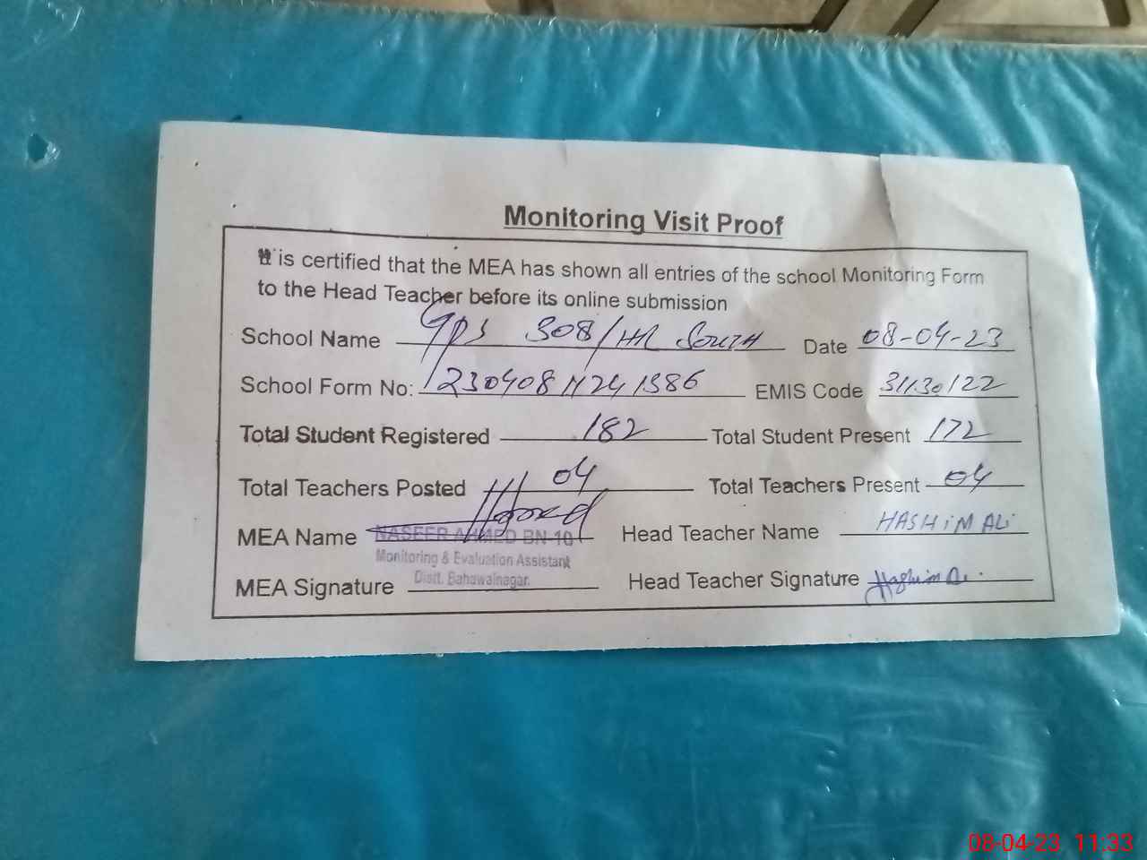| Attendance Register | Head Teacher | MEA with School | Visit Proof |