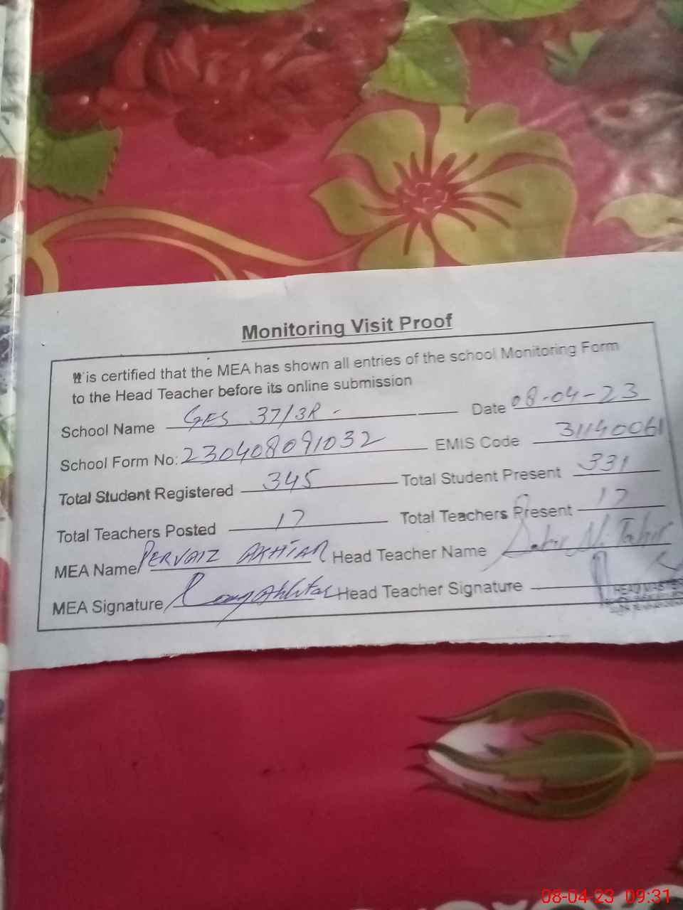 | EMIS Code: 31140061 | Name of School: GES CHAK NO. 37/3-R | |||